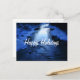 Happy Holidays postcard with blue snowy river at evening dusk in beautiful winter setting.