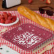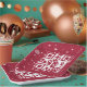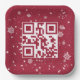 Red and white QR Code reading Happy Holidays on a red background with scattered snowflakes.