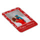 This holidays Christmas card design features your custom photo overlay with white Christmas decorations on a red background and the text "Happy Holidays" with your personalised family name or text below in modern white script.