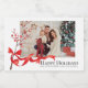 This elegant holidays design features the text "Happy Holidays" in a stylish black script with a personalised photo and your names. Decorated with a branch with red and coral decorations tied with a flowing red ribbon bow. To personalise edit the text boxes provided.