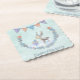 Adorable square Happy Holidays paper coasters featuring a warmly dressed bunny and his reindeer friend inside a decorative holiday wreath.