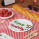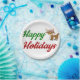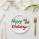 Paper plates with happy holidays in 3D green and red letters and a reindeer. Plates available in several sizes.