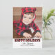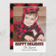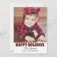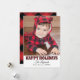 Modern "Happy Holidays" photo card includes a large photo space and black text that can be personalised. Features a rustic red and black buffalo plaid pattern on the front and back sides of the card with faux snow.