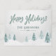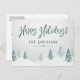 Rustic country holiday Postcards cards with "Happy Holidays" in a handwritten style along with your personalised family name or names and the year, all in pine green vintage typography. A beautiful scenic view of trees and winter snow in watercolor style artwork highlights the front of the card. The back of the card features text space for your personal holiday message or can be left blank for you to handwrite one if needed.