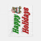 Blanket with happy holidays in 3D green and red text and a teddy bear with a gift. Available in several sizes.
