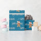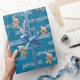 White HAPPY HOLIDAYS text with gingerbread men and snowflakes on an blue background.