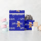 White HAPPY HOLIDAYS text with gingerbread men and snowflakes on a bright blue background.