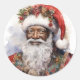 Santa's figure exudes both strength and serenity. His red suit stands out against the snowy backdrop, while his white beard and warm smile create a sense of kindness. A weathered sack filled with toys rests at his feet, a silent promise of Christmas joy to come.