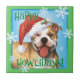 Celebrate the holiday season with a happy, cute American Pit Bull Terrier wearing a Santa hat and scarf amid snowflakes and the words, Happy Howlidays! Great holiday gift idea for APBT-loving family and friends.