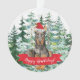 Cute dated Doberman Dog Christmas ornament set on a pine & spruce tree background with the holiday message "Happy Howlidays" . Visit our shop to view a large assortment of dog breads