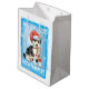 Celebrate the holiday season with a present in this cute gift bag decorated with a cute Siberian Husky puppy wearing a Santa hat and scarf amid snowflakes and the words, Happy Howlidays! Great holiday gift idea for Husky-loving family and friends.