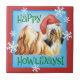 Celebrate the holiday season with a cute Lhasa Apso wearing a Santa hat surrounded by snowflakes and the words, Happy Howlidays! Great holiday gift idea for Lhasa-loving family and friends.