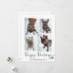 A modern holiday card features four of your favourite personal pet photos in a unique, layered photo grid. The black and white card design says "Happy Howlidays" in elegant, trendy handwritten script typography, cute watercolor berry and leaves, and a spot for your name in a coordinating sans serif font. Back text can be edited or deleted to add your own personal handwritten message. Photos courtesy @casa_de_frenchies_ on Instagram. © Marisu Valencia