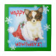 Celebrate the holiday season with a cute Papillon puppy sitting in a Santa hat amid snowflakes and the words, Happy Howlidays! Great holiday gift idea for Papillon-loving family and friends.