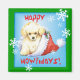 Celebrate the holiday season with a cute Toy Poodle puppy in a Santa hat and scarf amid snowflakes and the words, Happy Howlidays! Great holiday gift idea for Poodle-loving family and friends.
