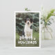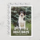 Send a playful “Happy Howlidays” holiday card featuring bold hand-lettered typography with cute paw print accents. Add your own pet photo, names, and year to create a fun, modern greeting for friends and family. The white text pops beautifully on a clean, photo-forward layout. The back features a coordinating black polka dot pattern for a polished, matching finish.