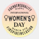 March 8th is International Women's Day button. Black and white key Women's Day sticker with female symbols and hashtags #genderequality and #inspireinclusion. Pink and yellow background.