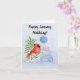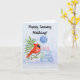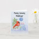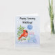 This hand-painted watercolor design features a bright red cardinal perched on a winter branch, holding a snowflake balloon and sitting beside a January birthday cake decorated with white and purple carnations—the traditional flowers for January.