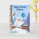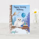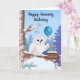 This charming January birthday card showcases a beautiful Snowy Owl holding a snowflake balloon while sitting beside a rich chocolate birthday cake. In the background, a small Barn Owl watches from a snowy winter scene, adding a touch of nature and seasonal magic. Perfect for anyone with a January birthday who loves owls, wildlife, and cozy winter themes, this unique nature-inspired birthday card brings charm, warmth, and winter wonder to their special day.