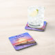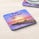 Beverage coaster with my original end-of-summer image of a dock, the American flag, and a setting sun. Customisable text says "Happy Labour Day!"