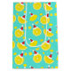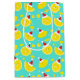 A medium gift bag with a pattern of smiling lemons in Santa hats on a bright teal background.