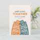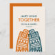 Happy living together card with cartoon retro style city buildings.