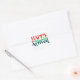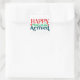 This Happy Mail has Arrived sticke has writing in red, green, and a dark teal. There are hearts and dots to emphasise the happy.