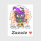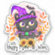 This adorable Halloween sticker features a black cat wearing a purple witch hat alongside the playful phrase “Happy Meow-o-ween.” Perfect for cat lovers and fans of spooky season with a cute twist, this whimsical design blends Halloween magic with feline charm for a fun, festive vibe.