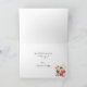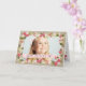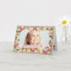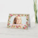 A lovely personalised photo greeting card that features your child or family photo on the front surrounded by a frame of pretty pink and blush flowers and green leaves, bordered with a burlap linen look background. Inside, you customise the personal message.