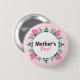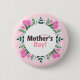 Happy Mother's day button decorated with pink tulips, white tiny flowers and green leaves.