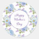 Small round happy Mother's Day sticker is shown with a lovely blue and purple floral print.