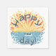 A cheerful sun rises over a blue horizon with colourful rays spreading outwards, accompanied by the text "happy new day!" in playful lettering. a vibrant and optimistic piece of art.