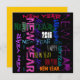 Designed for 8 letters : NEW YEAR (7 + space) with year+ happy. Design on square flat card invitation with black background (in front) and yellow background in back. You can easily change background colour and text (colour, font, size and position) by clicking the personalise or customise button. Matching greeting card, paper napkin, paper plate, gift bag and more... Joy and unconventional greeting for Happy New Year 2019.