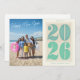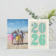 Celebrate the start of 2026 with this stylish and modern New Year photo greeting card! The design features large, decorative turquoise "2026" numbers on the right and a customisable photo area on the left — perfect for a family beach vacation snapshot or any favourite memory. The handwritten-style "Happy New Year" greeting in white pops beautifully against the blue sky background. Below, a cheerful message reads: "See you in 2026 – Cheers, the Brown family." All text is fully editable to suit your personal message. Ideal for families or couples sending casual, warm wishes — whether from a New Year's getaway or just sharing a special photo.
