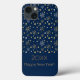 Merry Christmas & 20XX Happy New Year! XMAS Wishes iPhone Case with Christmas magic gold luxury elements. Winter Holiday gifts elements pattern, Christmas ball, gold snowflakes, Christmas stars, confetti, falling snow, gifts and more festive symbols on Navy Blue background. Original trendy graphic design for Electronics > Phone Cases & Accessories > iPhone Cases > iPhone 13 Cases, Luxury elegant design with text template. Personalise them by adding your Wishes Text, two sides graphic festive decoration.