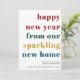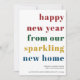 Colourful Happy New Year card which doubles up as a moving announcement card. The bold typography reads "happy new year from our sparkling new home" is lettered in big and bold modern typography and the design can be edited for a single person or a family. You can also add your new address and your name(s). A headline statement design to let everyone know your new address.