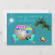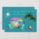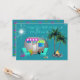 Happy new year cards with camping trailer design and custom text. Wish friends and family a Happy New Year from the campsite. This design is made up of a little silver camper, surrounded by palm trees, a campfire, chairs, lawn flamingoes, and a seashell. Text is added over a starry sky.