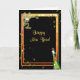 A festive New Year greeting with champagne bottle with popped cork, clock striking midnight tied with gold ribbon and bow and gold stars on black background with colourful frame.