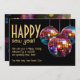 A different, but sparkling New year Holiday card with trendy disco balls in sparkling colours. The background black making the disco balls, colours and golden text pop.The font is in a retro and groovy style as the disco era in the 70s. the back has the light flairs from the disco balls as a fun colour splash.