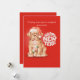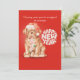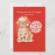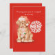 A fun holiday card featuring a cute dog wearing a Christmas hat and holding a red-and-green striped stocking. Set on a bold red background with “Happy New Year” written in a playful style, this festive design is perfect for sending warm seasonal wishes. Ideal for pet lovers and cheerful holiday greetings.