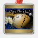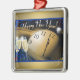 Square premium ornament with an image of a clock with Saturn rings that is about to strike twelve, and two glasses of champagne on a blue and black confetti background. See the entire New Year Ornament collection under the HOME category in the HOLIDAYS section.