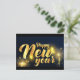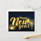 Happy New Year golden text with fireworks and dark blue background, festive celebration, postcard design, elegant typography, for the holiday season.