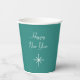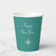 Happy New Year teal green and white paper cup, with a snowflake design and customisable typography lettering. A trendy and festive addition to your New Year's party or winter celebration.