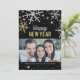 Festive holiday photo greeting card design features sparkling silver and gold snowflakes and "Happy New Year" wording with custom text and a picture that can be personalised. Winter snowflake border and script have a textured glitter looking appearance on a black background.