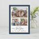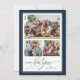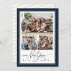 This New Years greeting card features elegant script typography and space for 3 photos. The design is accented with a dark blue and gold border. Add your own personal message to the back of this holiday card.