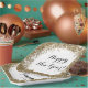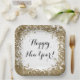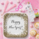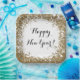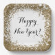 A white Happy New Year paper plate with a printed gold glitter design and a script message. Edit using the text editor to make your own message if you'd like to. Perfect for both a casual and fancy New Year's Eve get together.