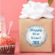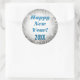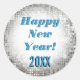 Popular Disco Party Pattern Happy New Year Silver Stickers! Cool, cute, fun shining glitter looking stickers and envelope seals or party favours design are perfect with this popular round shape. A cool, trendy sticker in glamourous silver sequins LOOK background pattern close up of a retro, vintage, sparkling, shiny disco dancing style mirror ball dance globe. Make nice fun gift tags for birthday parties, holidays, christmas, hanukkah, new years, anniversary parties, graduation, engagement and wedding, etc. too! Customise some of these fun stickers today! Text in cool 3d effect look reads: "Happy New Year! 20XX" in bold blue text ~ready for you to add the year onto the white gradient background graphic. Perfect for your guests and to ring in the new year celebration!