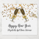 sparkling wine glasses sparkling wine labels for your New Year's eve party. Customise with your name. Toasting sparkling wine glasses and gold confetti on white.