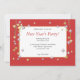 A New Year's party invitation with shiny silver and gold stars and bells on a red and white background.