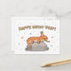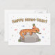A new year greeting postcard with a cute doodle of a red spotted newt on a rock with a party hat and a party blower with the funny pun caption that reads' Happy Newt Year!" with colourful confetti in the background. Amusing doodle to start the new year!
